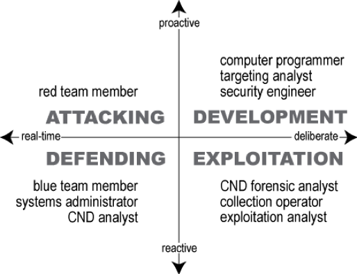 Figure 1. Schematic of the dimensions on which example cyber careers differ. The quadrant names (in bold uppercase font; e.g., ATTACKING) correspond to a major job task that has the characteristics described on its axes (for instance, “defending” requires real-time reaction, while “development” requires proactive deliberation). Example job titles, which appear within quadrants, are taken from the NICE framework [8].