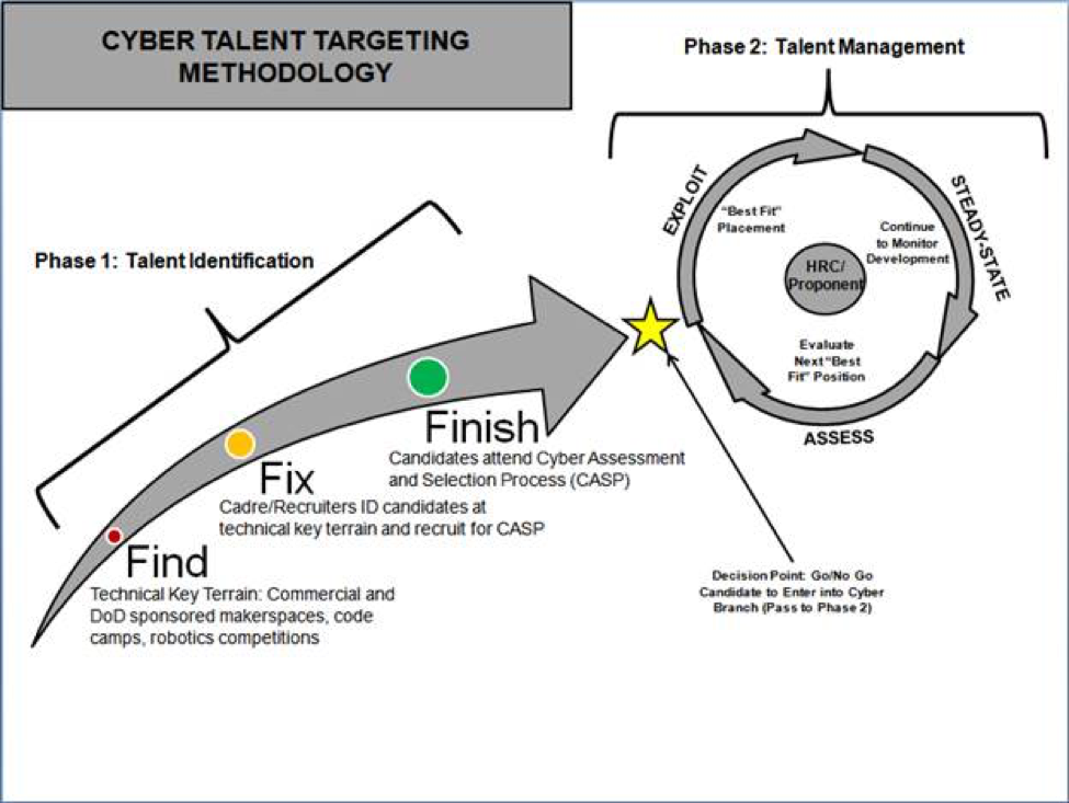 One methodology employed by the Army to target such individuals is the Find, Fix, Finish, Exploit, Analyze, and Disseminate (F3EAD), which is a “technique that works at all levels for leaders to understand their operational environment and visualize the effects they want to achieve” [14]. Finding targetable cyber talent is similar to finding the exact location of “a HVI in the midst of civilian clutter”; however, finding the “accurate location enables surgical finishing effects that emphasize speed to catch a mobile target” [14]. The Army could modify the F3EAD targeting process to identify and manage its cyber talent into Find, Fix, Finish, Exploit, Steady-state, and Assess (F3ESA). The F3ESA Cyber Talent Targeting process is two phased with phase one focusing on CTI and phase two focused on Cyber Talent Management (CTM). Cyber Branch can apply F3ESA in acquiring both non-cyber Soldiers internally from the Army and external candidates from commercial, joint, inter-agency, and academic populations. The remainder of this section will focus on phase one. See Figure 2 for the Cyber Talent Targeting Methodology.
