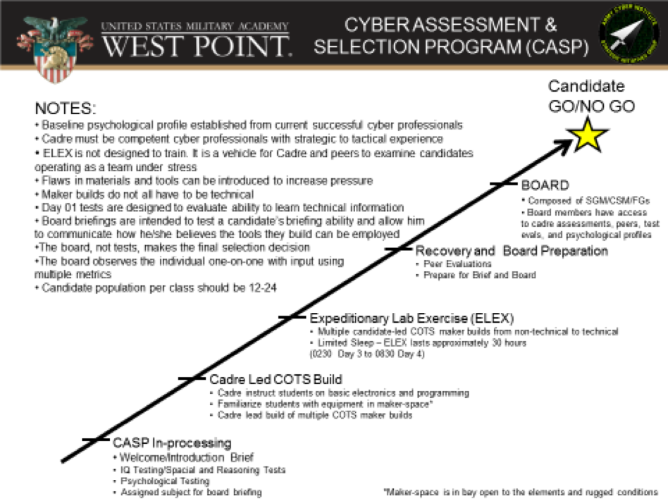 One proposed way to assess potential cyber personnel is to conduct a 5-day assessment course similar to one used by the 75th Ranger Regiment. Once identified and engaged during the “Find” and “Fix” pieces by recruiters at civilian and DoD key technical terrain, candidates would be invited to attend the CASP to gain entry into the Cyber branch. The Cyber Center of Excellence at Ft. Gordon could operate the program or at other Army cyber “centers of gravity.” CASP would consist of a one week program enabling both quantitative and qualitative assessments and should contain the following elements: