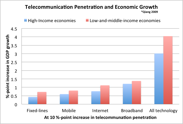 In 2013, the penetration rates in low-and-middle-income countries in mobile, Internet, and fixed-line broadband increased by 4.06, 3.01, and 0.57 percentage-points respectively.[33] A World Bank study captured in the chart above translates this expansion into a 0.76 percentage-point boost to economic growth.[34] In 2013, low-and-middle-income countries achieved 4.9% annual growth in gross domestic product (GDP).[35] Thus, rising telecommunications penetration rates may account for nearly one-sixth of their economic growth. Mobile access alone contributed to over 8% of growth. Wireless networks seemed poised to unleash latent economic forces across developing countries.[36]