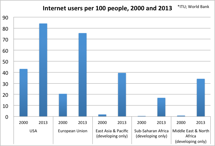 From 2000 to 2013, the Middle East and Africa experienced a 3000% expansion in Internet users. Meanwhile, Asia Pacific boasted over a 2000% expansion.