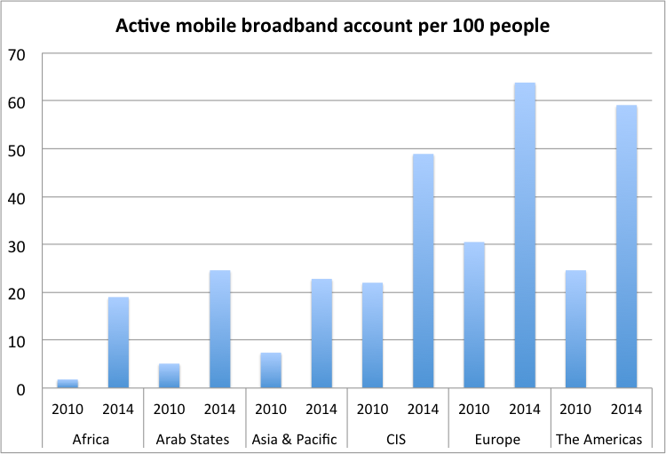 Since developing countries do not possess decades of legacy systems requiring a overhaul, they can rapidly adopt newer ICTs.[42] Mobile broadband (2G or greater) continues to expand around the world.
