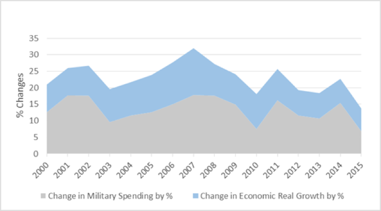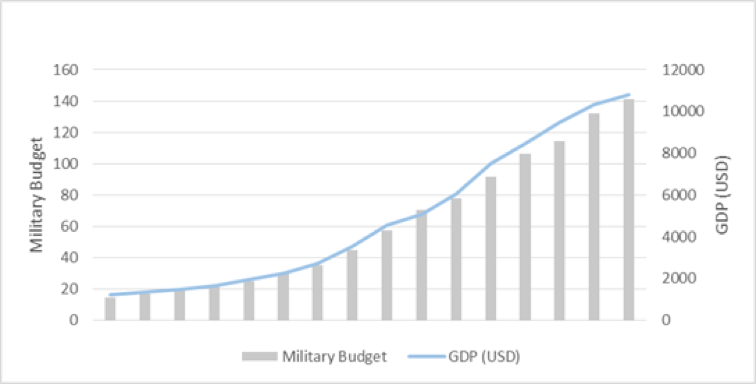 With civilian economic growth leading to corresponding fluctuations in military spending, China’s government is encouraged to do well economically in order to grow militarily. These close ties can be seen in the correlation between military spending and gross domestic product in the last decade, as illustrated in Figure 2: